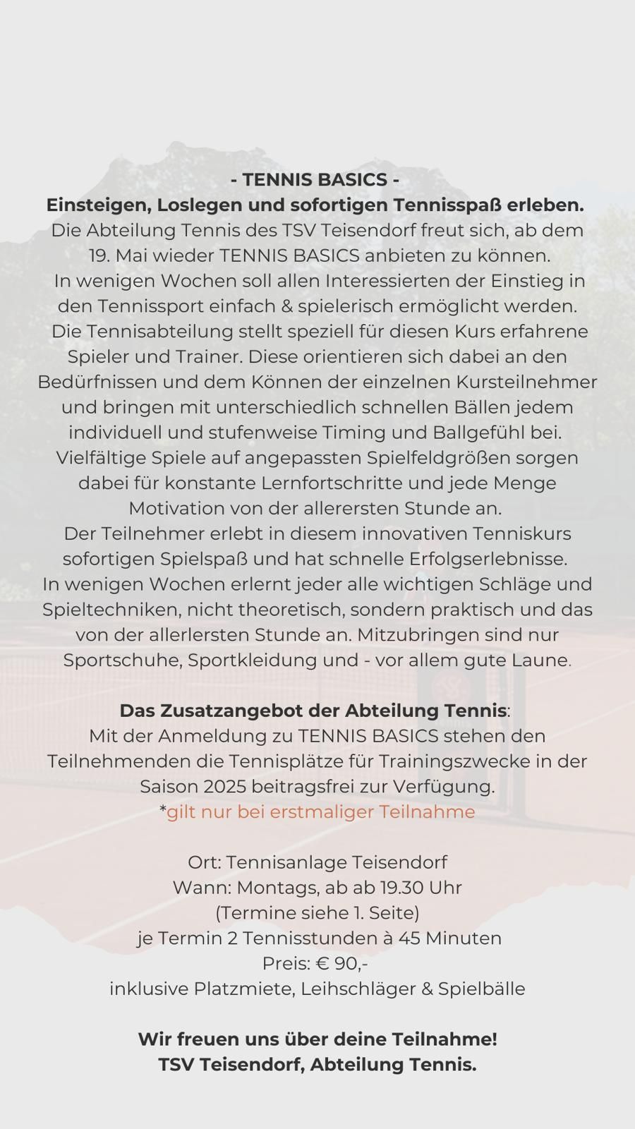 Das Zusatzangebot der Abteilung Tennis: Mit der Anmeldung zu TENNIS BASICS stehen den Teilnehmenden die Tennisplätze für Trainingszwecke in der Saison 2025 beitragsfrei zur Verfügung. (gilt nur bei erstmaliger Teilnahme)